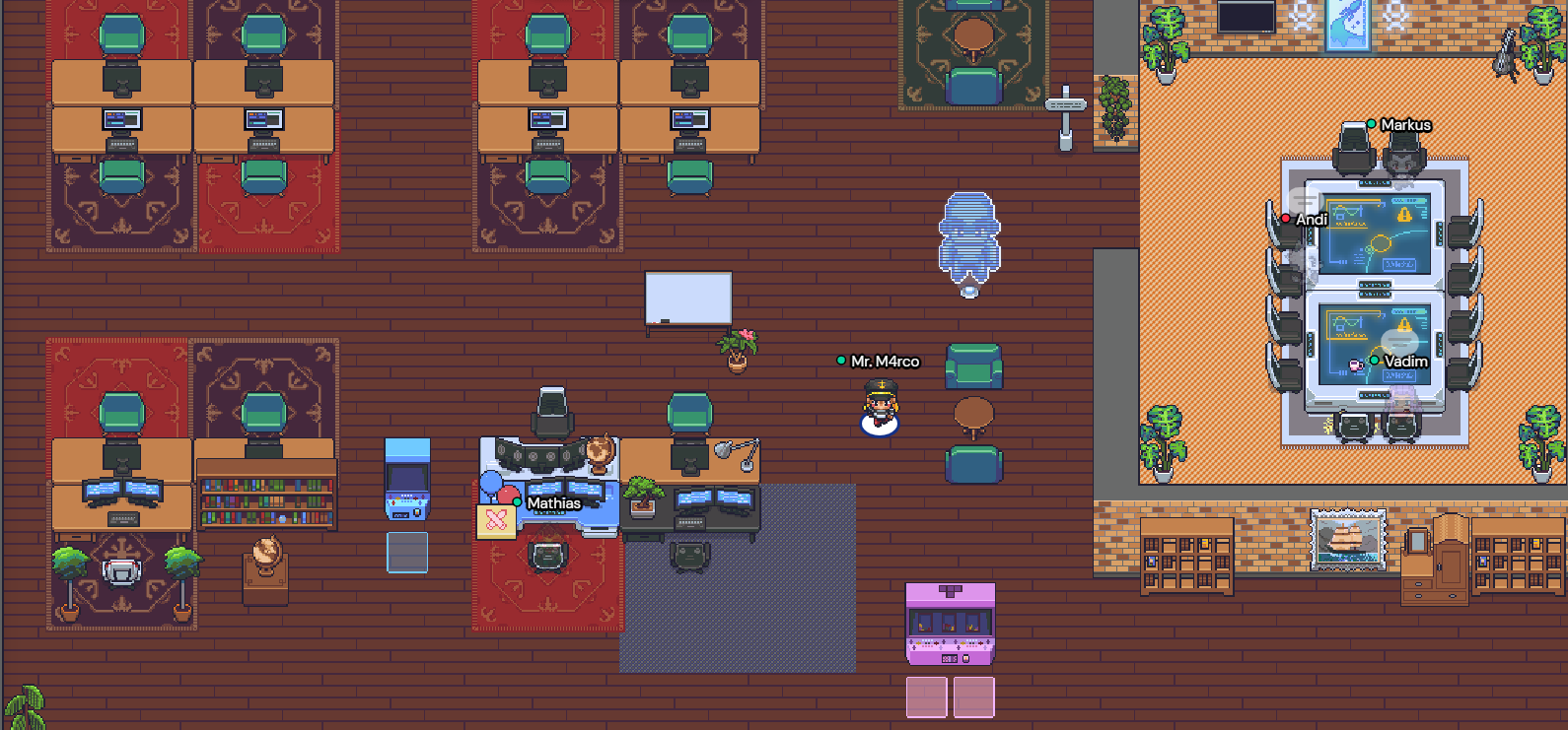 Als remote arbeitendes Team sehen wir uns normalerweise nur virtuell. Dennoch haben wir ein eigenes Online-Büro mit eigenen Arbeitsplätzen und Meetingräumen: